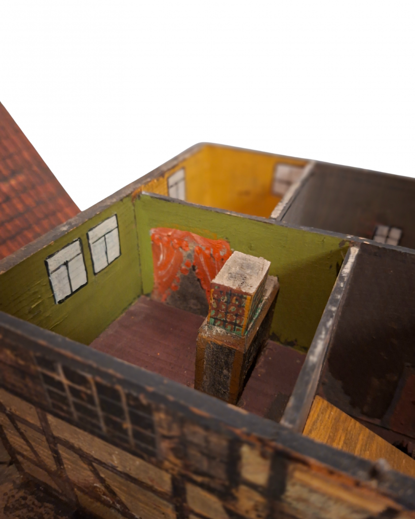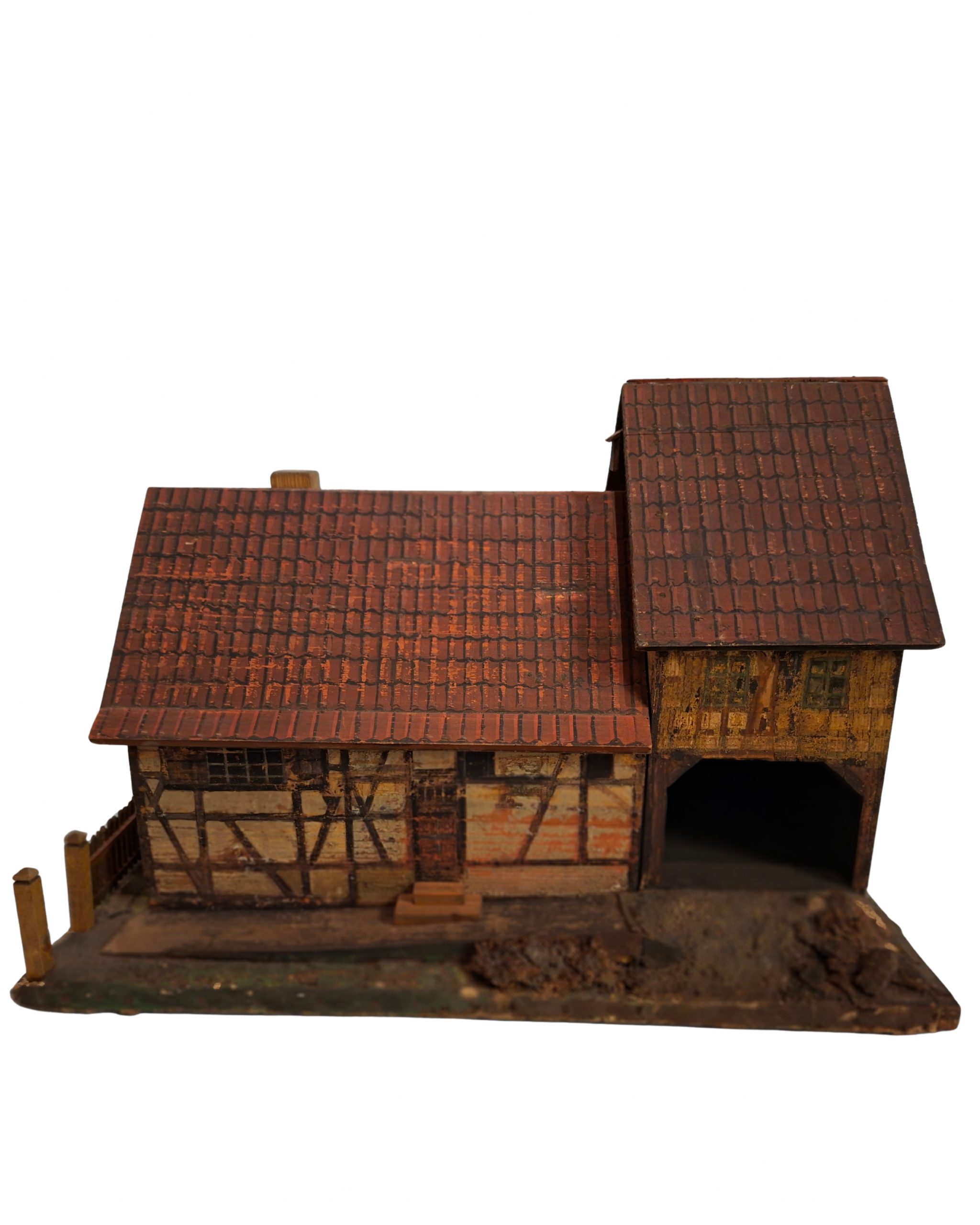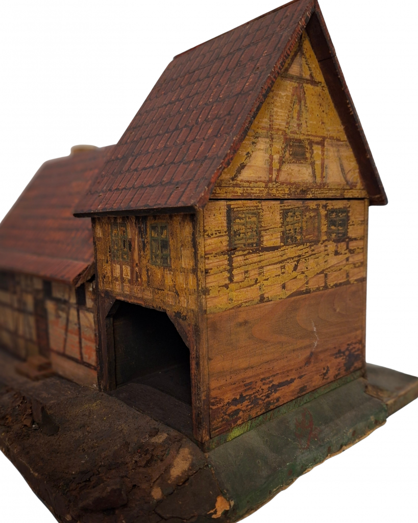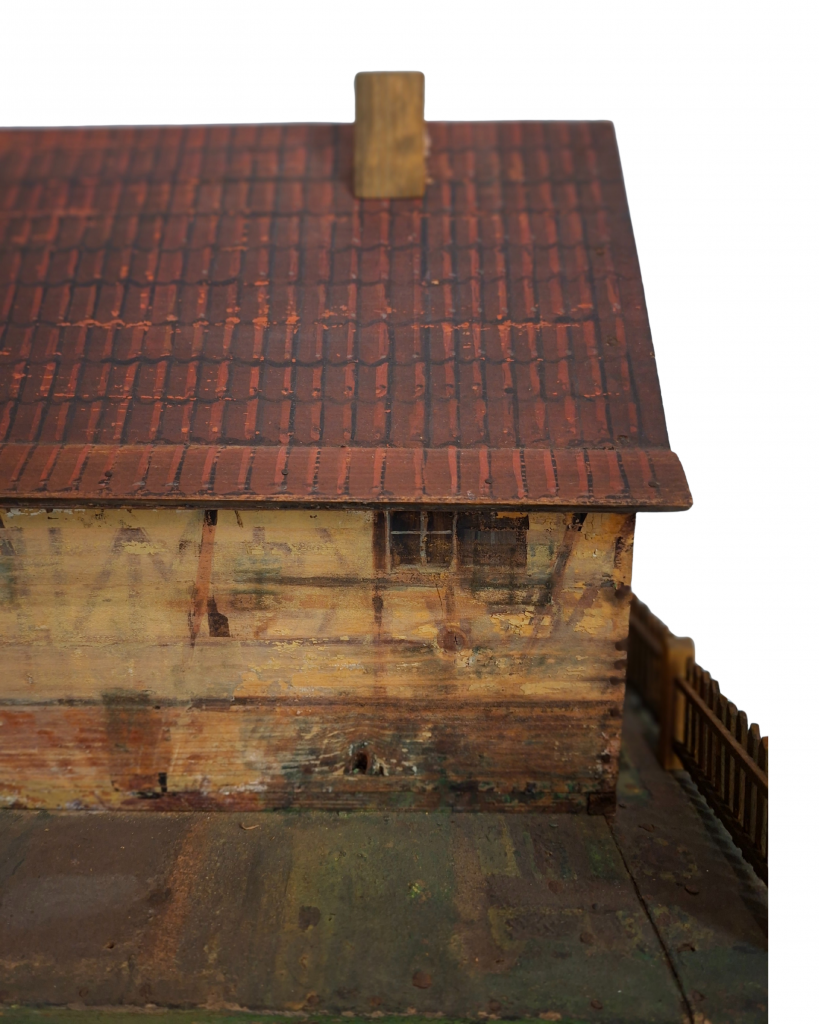Das Modell eines Fachwerkhauses (Abb. 1–7) wurde aus zurechtgesägten und bemalten Sperrholztafeln zusammengeklebt bzw. genagelt. Die Fachwerkkonstruktion, Fenster und Türen sind aufgemalt. Unter der stellenweise abgeriebenen Bemalung wird die Bleistiftvorzeichnung erkennbar. Teilweise ist das Fachwerk mehrfach übermalt worden (Abb. 3–4). Auf die Satteldachflächen wurde eine Eindeckung aus roten Ziegelsteinen gemalt. Das Modell steht auf einer rechteckigen Bodenplatte. Die Flächen um das Haus sind als Grünflächen gestaltet. Vor der Giebelseite wird das Grundstück von einem Gartenzaun mit Torpfosten begrenzt. Der Zugang zum Haus erfolgt zwischen den Torpfosten hindurch über eine Rampe und ein Treppenpodest zur Eingangstür an der Traufseite. Das Fachwerkhaus besteht aus zwei aneinandergefügten Bauteilen: einem längsrechteckigen Wohnhaus mit Eingangstür und einem daran anschließenden schmaleren und höheren Bauteil mit großer offener Toreinfahrt. Die Dächer der beiden unterschiedlich hohen Bauteile sind abnehmbar, so dass die Innenraumaufteilung sichtbar wird. Über der Toreinfahrt findet sich ein großer Speicherraum mit Innentreppe (Abb. 6). Die Fenster der Außenfassade über der Toreinfahrt entsprechen nicht dem einen Fenster auf der Innenwand. Auch die Innenraumaufteilung im Wohntrakt des Hauses entspricht nicht der äußeren Fassadengestaltung. Die Innenraumwände sind auffallend bunt gestrichen. In manchen Räumen stehen Einrichtungsgegenstände. In der grün gestrichenen Wohnstube findet sich ein großer Kachelofen (Abb. 7). Durch eine mit rotem Vorhang versehene aufgemalte Wandöffnung gelangt man in den angrenzenden, gelb gestrichenen Raum. In einem grau gestrichenen Raum steht ein Küchenherd auf einem gestuften Podest. Treppeneinbauten, aufgemalte Türen und Fenster deuten darauf hin, dass das Hausmodell offensichtlich mehrfach verändert wurde und dadurch architektonisch nicht stimmig ist.
