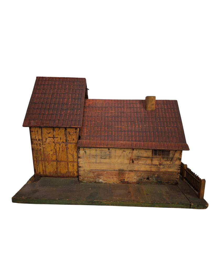 Das Modell ist an der hinteren Schmalseite der Bodenplatte signiert und datiert: „A. Krenz 1907“ ist dort in Schreibschrift in brauner Farbe zu lesen. Wer A. Krenz war, ist bislang nicht bekannt. Bereits drei Jahre später, 1910, ist das Modell zusammen mit vier weiteren in den Sammlungsbestand des Hennebergischen altertumsforschenden Vereins (HAV) übergegangen und war fortan im Vereinsmuseum in Meiningen ausgestellt. Im 1912 publizierten „Führer durch das Museum des hennebergischen altertumsforschenden Vereins in Meiningen“ werden die „fünf Dorf- bzw. Hausmodelle (Nr. 6529-6532)“ erstmals kurz beschrieben. Das gezeigte Modell stellt demnach vermutlich „das fränkische Fachwerkhaus“ dar. In dem Text wird auch der Herstellungsort, die „Industrieschule zu Sonneberg“, genannt. Dank Witters Recherchen kennen wir außerdem den Einlieferer bzw. Schenker der Modelle an den HAV: Es war Eduard Fritze, damals Direktor des HAV. Möglicherweise aufgrund dieser Provenienz wurde das Objekt im Begleitheft zur Ausstellung „Henneberg durch Land und Zeit“ als ein im Umkreis Eduard Fritzes am Technikum Hildburghausen entstandenes Modell bezeichnet. Eindeutige Belege hierfür gibt es jedoch nicht.