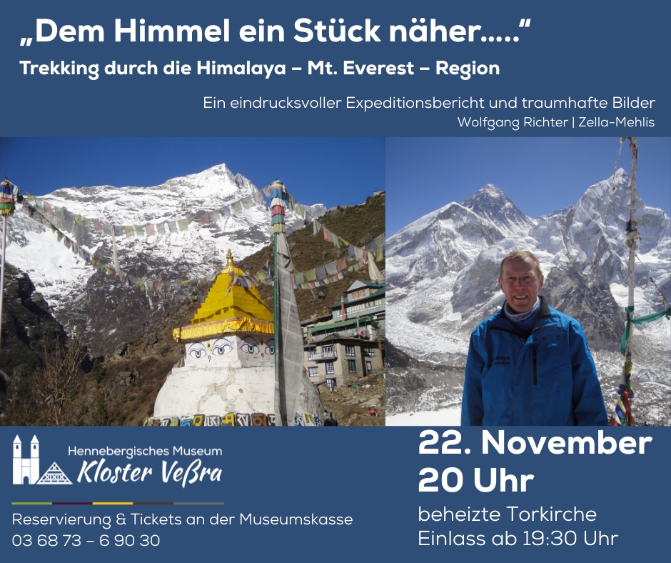 Nach kurzer Einstimmung mit nepalesischer Musik unter buddhistischen Gebetsfahnen nimmt Wolfgang Richter in seinem spannenden Expeditionsbericht die Gäste mit